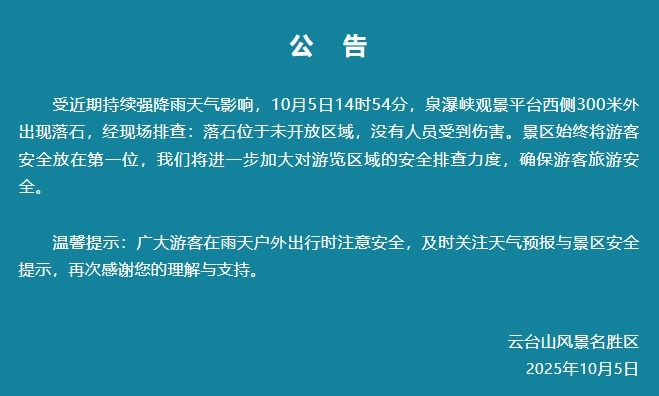 【大河财立方消息】10月5日晚间,云台山风景名胜区发布公告,受近期持续强降雨天气影响,10月5日14时54分,泉瀑峡观景平台西侧300米外出现落石,经现场排查:落石位于未开放区域,没有人员受到伤害。