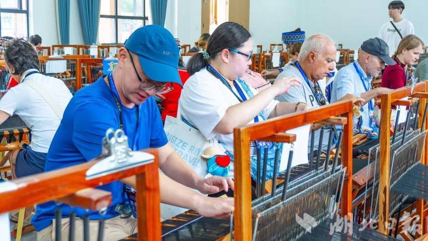 湖北日报客户端讯(通讯员李大雁)木织机“吱呀”作响,五彩丝线在指尖飞舞,外国旅行商们小心翼翼地将梭子穿过经线,脸上洋溢着惊喜与专注……9月9日,由湖北省文化和旅游厅主办的“知音湖北·2025全球旅行商大会”踩线活动正式进入恩施环节。来自40多个国家的约160位旅行商代表抵达宣恩县,在高罗镇麻阳寨村西兰卡普研学基地,亲身体验了土家族千年织锦技艺的独特魅力。